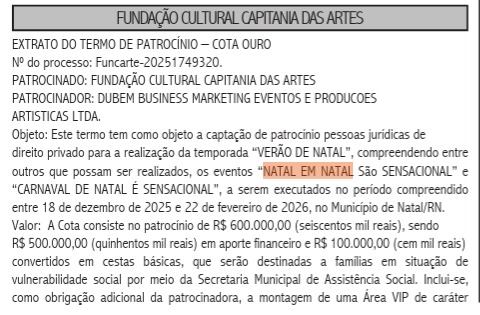 A Dubem Marketing Eventos e Produções informa que cumpriu todos os requisitos exigidos pela Fundação Cultural Capitania das Artes para se tornar patrocinadora dos eventos “Natal em Natal”, “é Sensacional” e “Carnaval de Natal” é Sensacional”. Além dos recursos financeiros destinados à fundação, o patrocínio contempla a entrega de cestas básicas para famílias em situação de vulnerabilidade social e viabilizará a geração de 300 postos de trabalho para diferentes categorias de profissionais, tais como marceneiros, designers, montadores, engenheiros, arquitetos, seguranças, motoristas, produtores etc. A Dubem tem tradição e presença em tais tipos de eventos e patrocina inúmeras festividades em diferentes lugares do país.