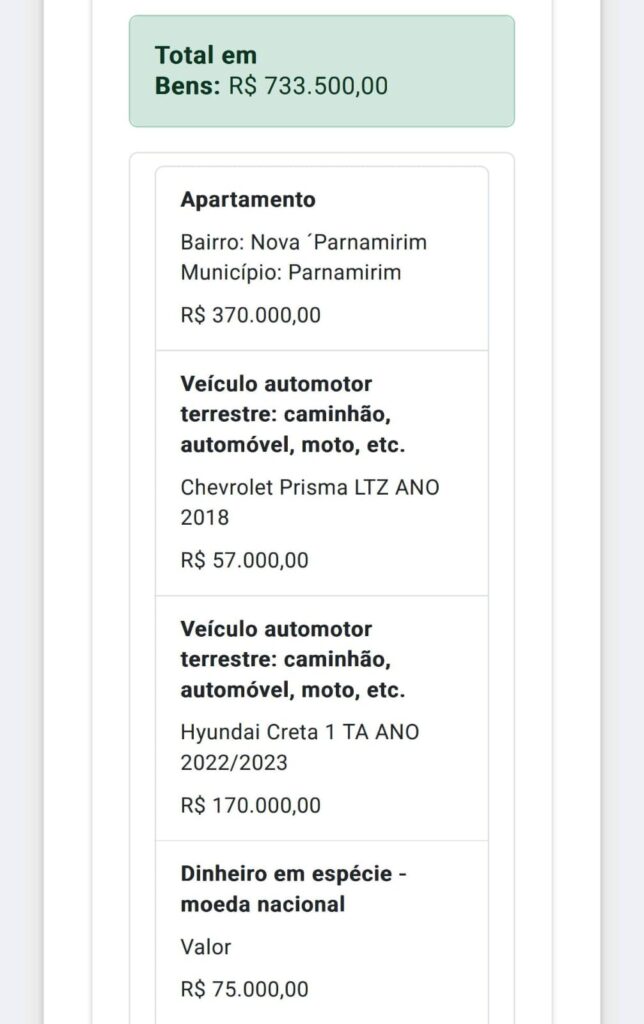 Seis anos depois, em 2024, ao concorrer e ser eleito vereador de Natal, o cenário patrimonial apresentado é quase cinco vezes maior. O total de bens declarados alcançou R$ 733,5 mil, valor quase cinco vezes superior ao registrado anteriormente. Entre os itens informados estão um apartamento em Nova Parnamirim, avaliado em R$ 370 mil, dois veículos, um Chevrolet Prisma (R$ 57 mil) e um Hyundai Creta 2022/2023 (R$ 170 mil), além de dinheiro em espécie, valores em depósitos bancários e uma casa localizada no município de Extremoz.