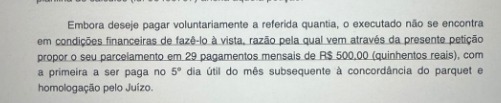 O histórico judicial do vereador conta ainda com outra condenação, desta vez por irregularidades em um processo licitatório. Ele foi obrigado a pagar mais de R$ 14 mil e firmou acordo para quitar o valor em 29 parcelas de R$ 500, conforme mostra um trecho do processo abaixo.