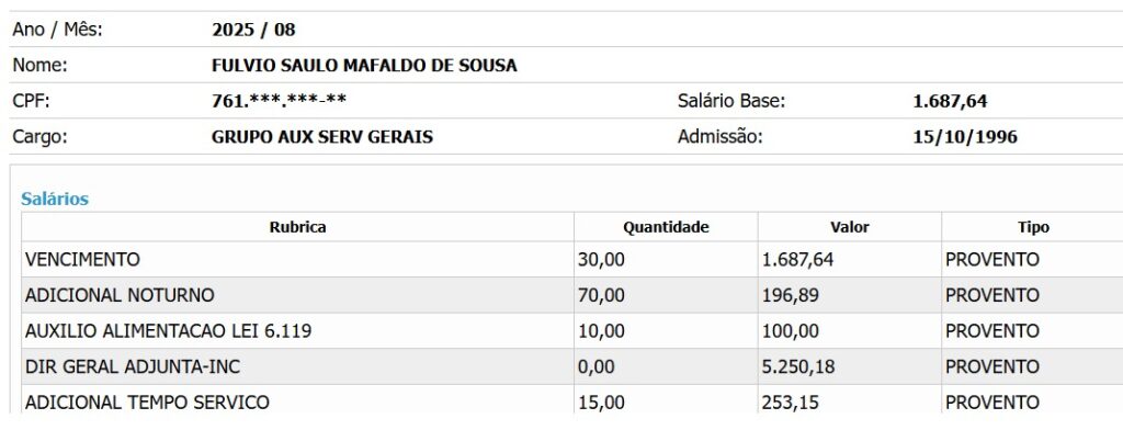 Outro ponto que gera debate é que Fúlvio recebe mais de R$ 5 mil além do salário de vereador por ocupar o cargo de diretor-geral adjunto. Além disso, ele também recebe adicional noturno, benefício destinado a servidores que trabalham entre 22h e 5h.