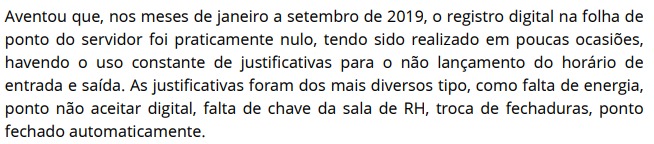 De acordo com o processo, entre janeiro e setembro de 2019 o servidor simplesmente não registrava o ponto. A maior parte das ausências aparecia como justificada no sistema interno. Entre as explicações apresentadas estavam: falta de chave, troca de fechadura, falta de energia e até falha na leitura da digital. É o que aponta o documento processual abaixo.